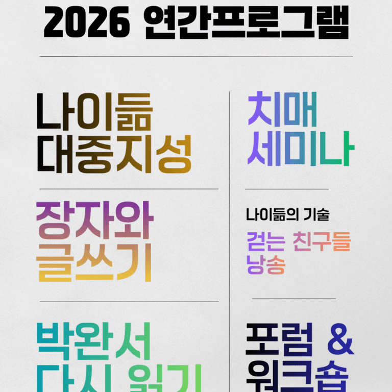나이듦연구소의 2026년 연간 프로그램을 소개합니다. 1월부터는 박완서 다시 읽기 세미나를 시작하고 3월부터는 나이듦대중지성과 장자와 글쓰기 세미나를 시작합니다.…