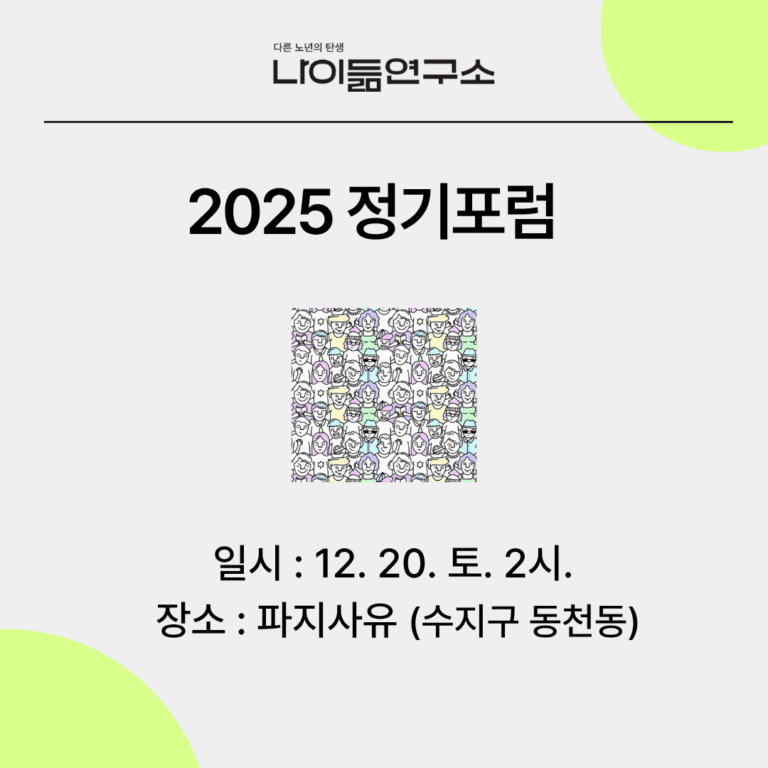 나이듦연구소가 2025 체인지메이커컨퍼런스의 토킹&네트워킹 프로그램에 참여합니다. 우리는 누구와 함께 늙어가게 될까요? 이미 우리 사회에는 혈연관계에 기반하지 않은…