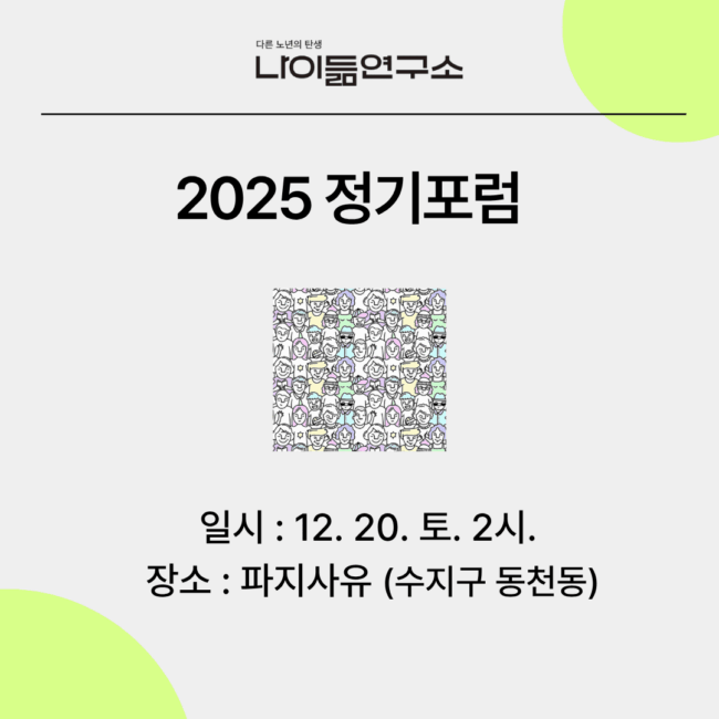 나이듦연구소의 포럼과 워크숍 프로그램에도 많은 관심 바랍니다.