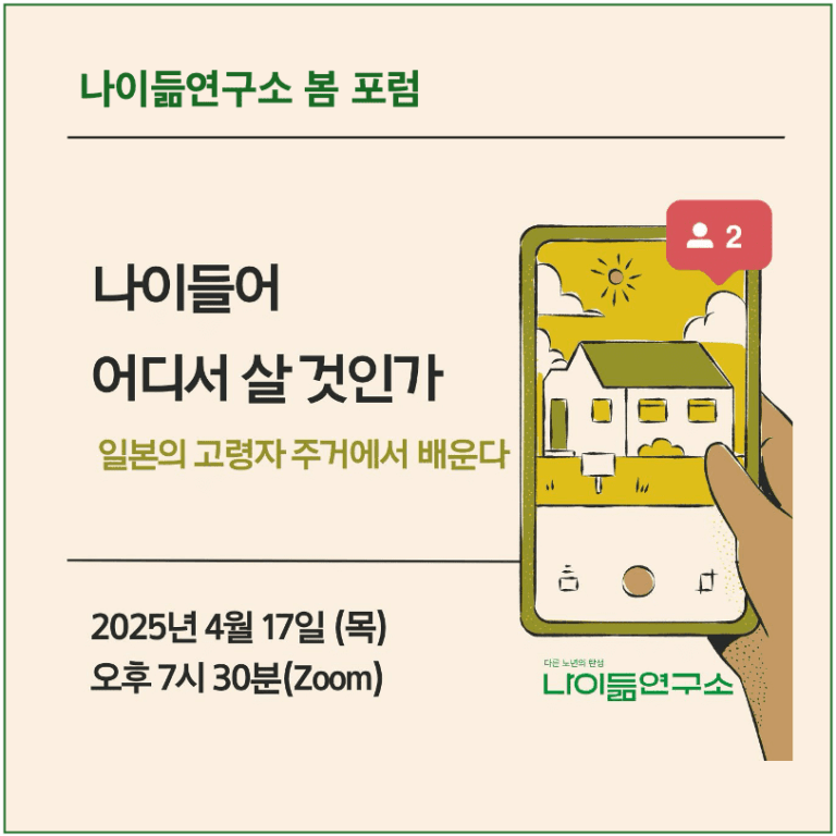 2025년 4월 17일 저녁 7시반에 나이듦연구소에서 마련한 첫 포럼 <나이 들어 어디서 살 것인가, 일본의 고령자 주거에서 배운다>가 줌으로 진행되었습니다. 강사로 초청된 김수동선생님은 현재 공동체주택 여백에서 이웃들과 함께 사시며 공동체주택…
