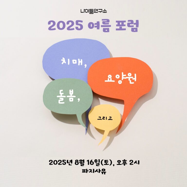 치매 돌봄과 요양원을 주제로, 치매 돌봄 유경험자 분들 그리고 부모 돌봄에 관여하고 있는 분들을 모시고 나이듦연구소의 두 연구원의 발제와 토론으로 진행합니다. 1부에서는 ‘치매 부모 돌보기의 기쁨과 슬픔’에 관혀여 2부에서는 ‘좋은…